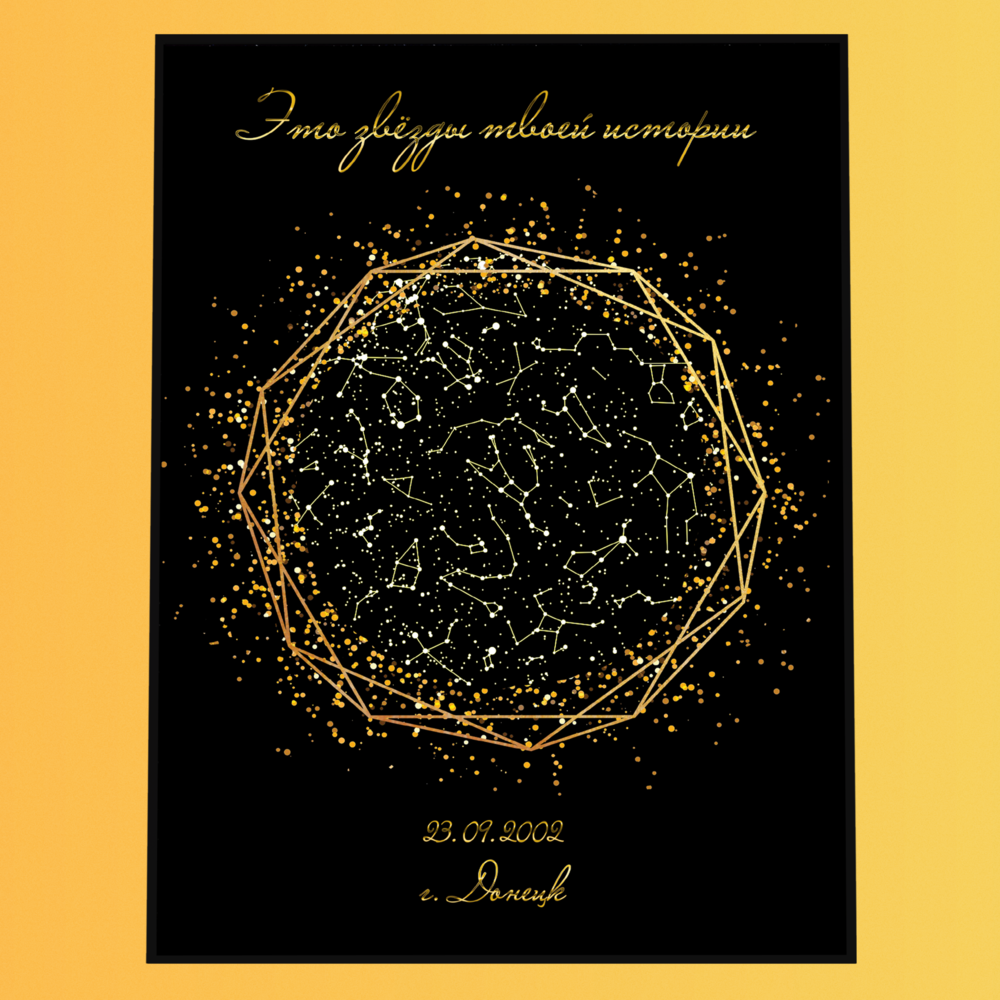Вы заказываете персональную звёздную карту — визуальный макет, отображающий расположение звёзд в конкретный момент времени и в выбранной точке на Земле. Карта создаётся на основе астрономических данных и оформляется в выбранном дизайнерском стиле.