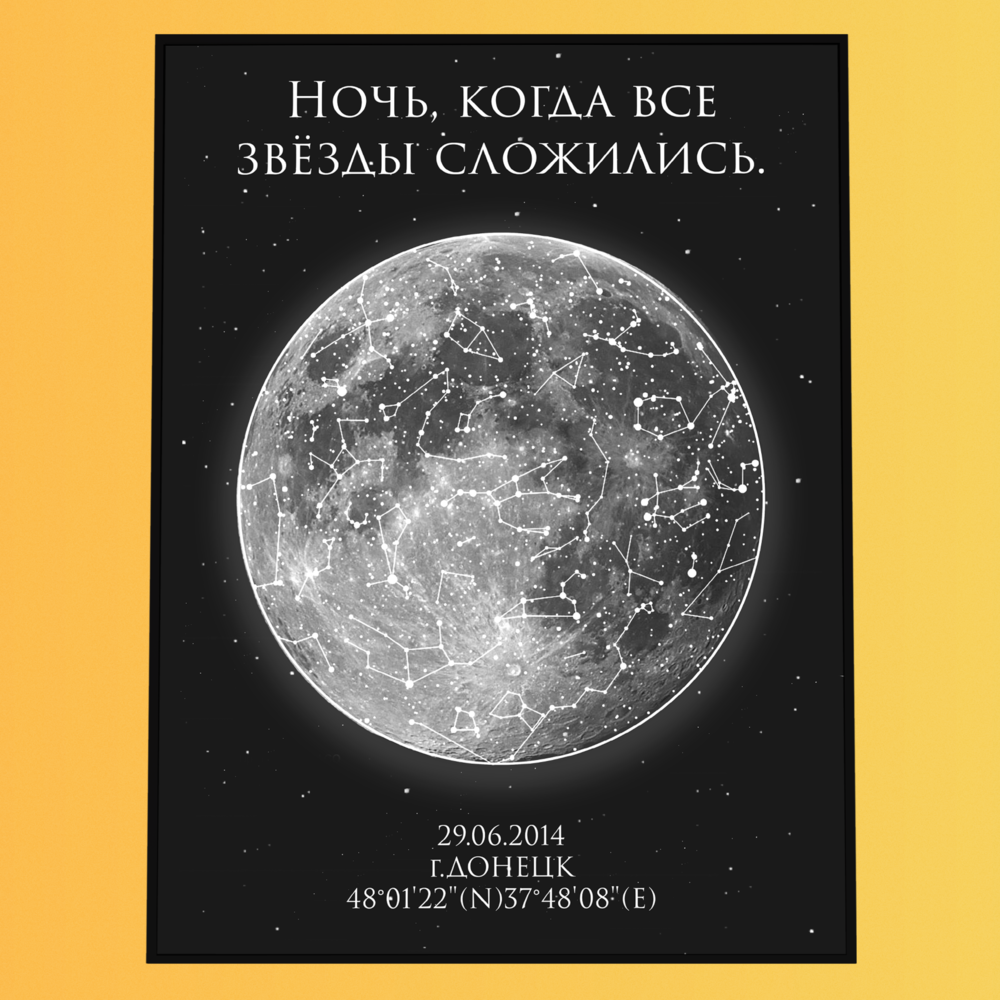 Вы заказываете персональную звёздную карту — визуальный макет, отображающий расположение звёзд в конкретный момент времени и в выбранной точке на Земле. Карта создаётся на основе астрономических данных и оформляется в выбранном дизайнерском стиле.