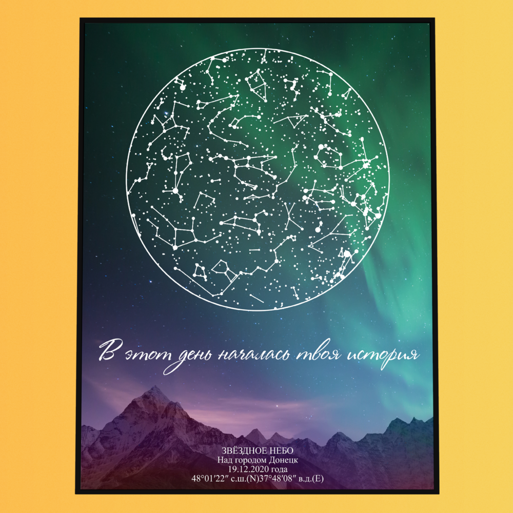 Вы заказываете персональную звёздную карту — визуальный макет, отображающий расположение звёзд в конкретный момент времени и в выбранной точке на Земле. Карта создаётся на основе астрономических данных и оформляется в выбранном дизайнерском стиле.