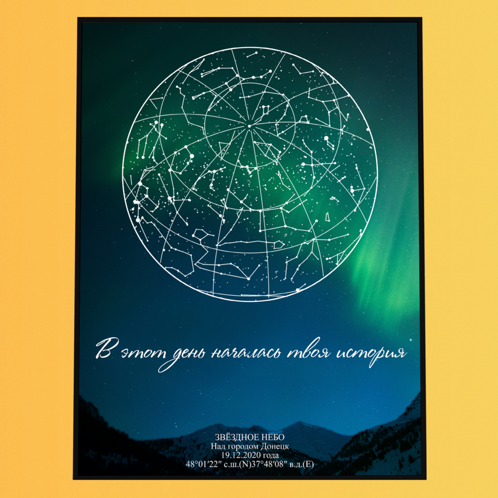 Вы заказываете персональную звёздную карту — визуальный макет, отображающий расположение звёзд в конкретный момент времени и в выбранной точке на Земле. Карта создаётся на основе астрономических данных и оформляется в выбранном дизайнерском стиле.