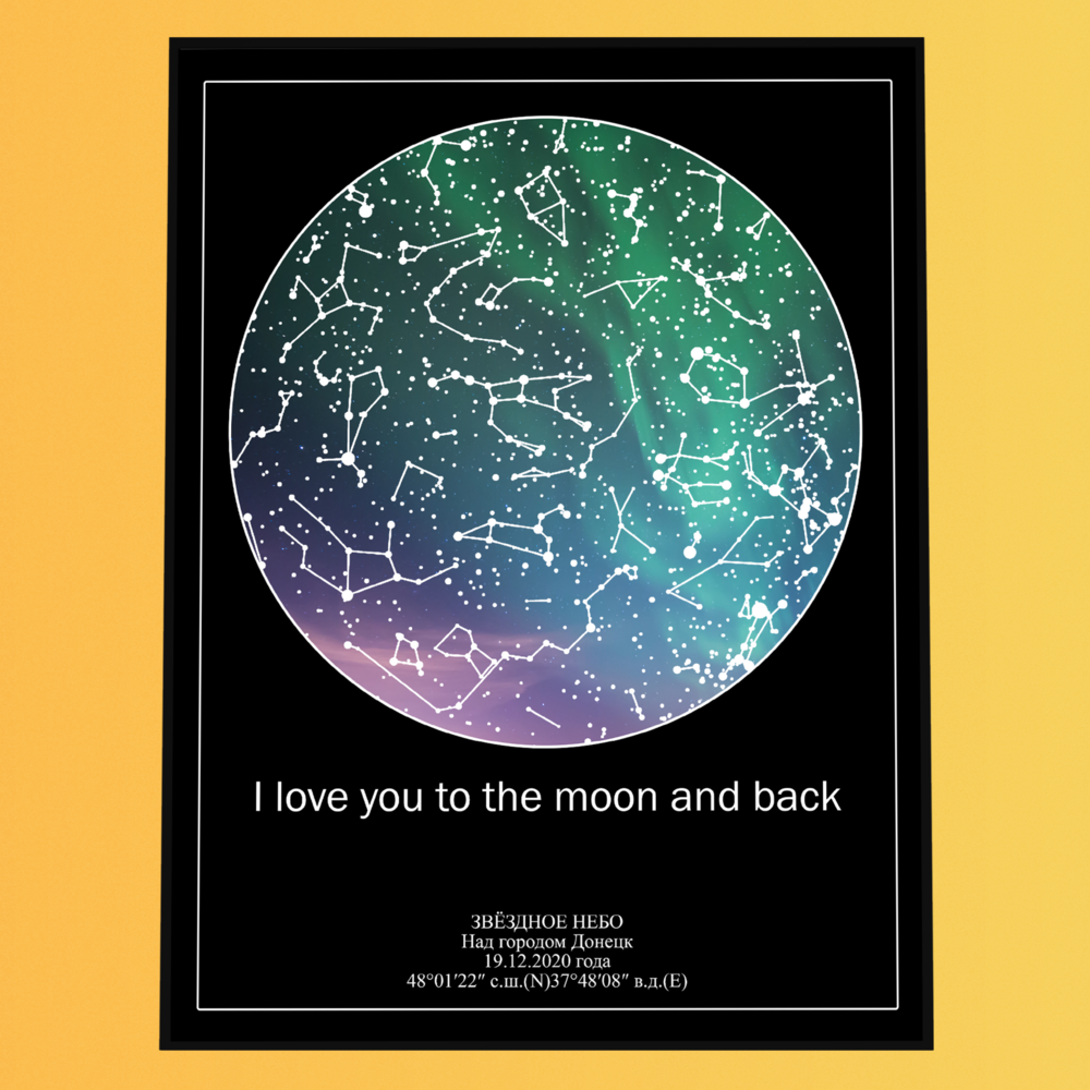 Вы заказываете персональную звёздную карту — визуальный макет, отображающий расположение звёзд в конкретный момент времени и в выбранной точке на Земле. Карта создаётся на основе астрономических данных и оформляется в выбранном дизайнерском стиле.