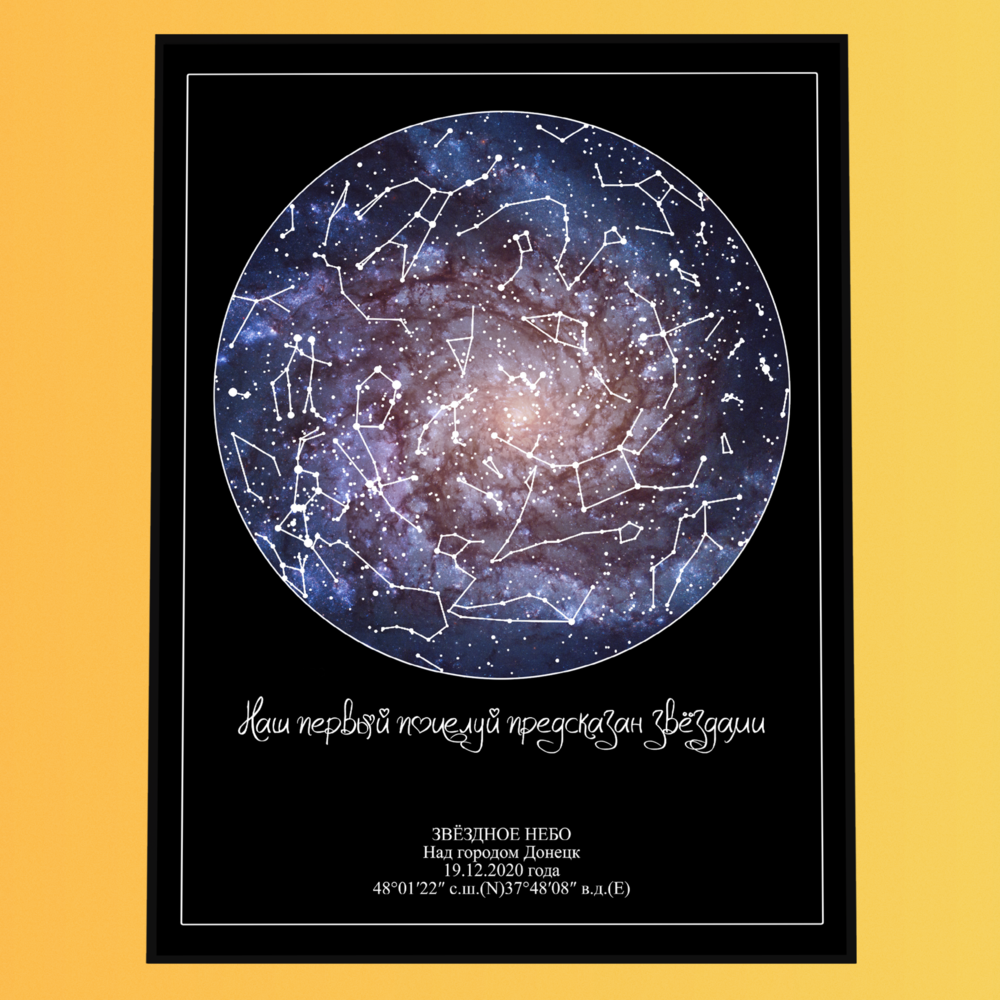 Вы заказываете персональную звёздную карту — визуальный макет, отображающий расположение звёзд в конкретный момент времени и в выбранной точке на Земле. Карта создаётся на основе астрономических данных и оформляется в выбранном дизайнерском стиле.