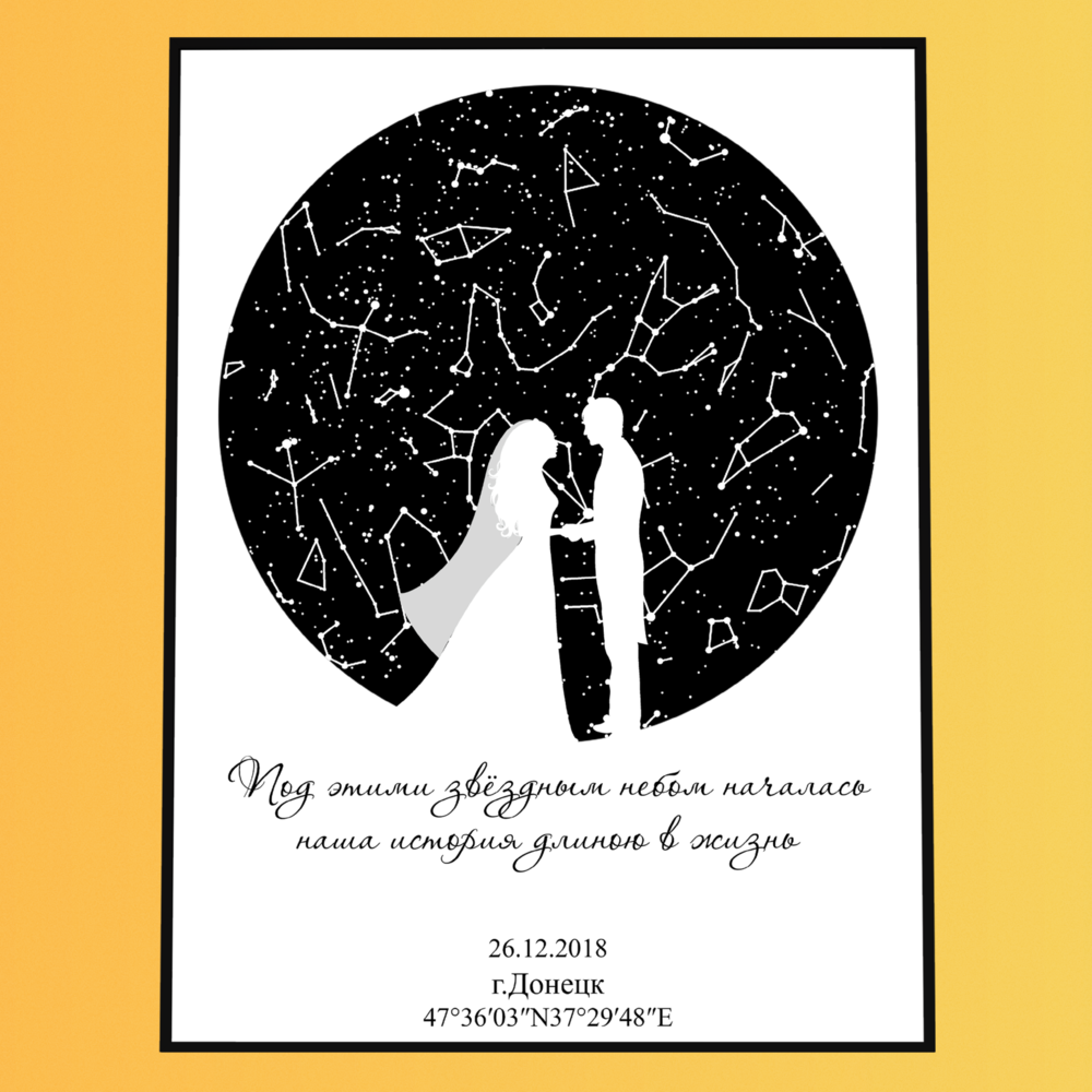 Вы заказываете персональную звёздную карту — визуальный макет, отображающий расположение звёзд в конкретный момент времени и в выбранной точке на Земле. Карта создаётся на основе астрономических данных и оформляется в выбранном дизайнерском стиле.