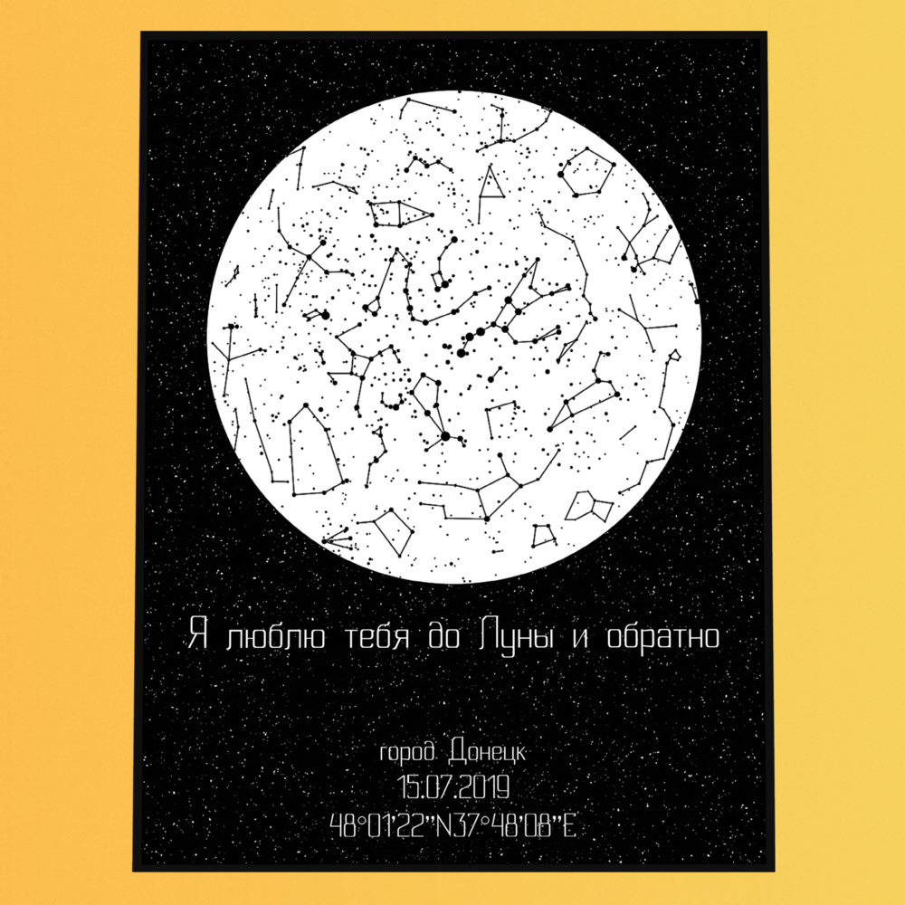 Вы заказываете персональную звёздную карту — визуальный макет, отображающий расположение звёзд в конкретный момент времени и в выбранной точке на Земле. Карта создаётся на основе астрономических данных и оформляется в выбранном дизайнерском стиле.