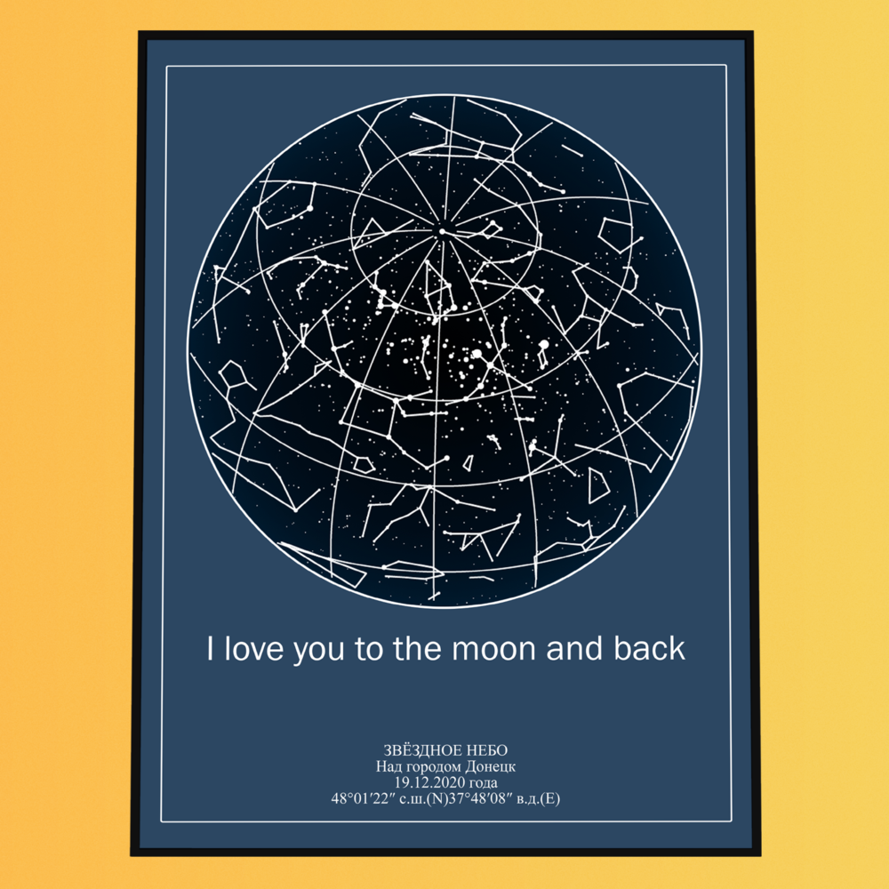 Вы заказываете персональную звёздную карту — визуальный макет, отображающий расположение звёзд в конкретный момент времени и в выбранной точке на Земле. Карта создаётся на основе астрономических данных и оформляется в выбранном дизайнерском стиле.