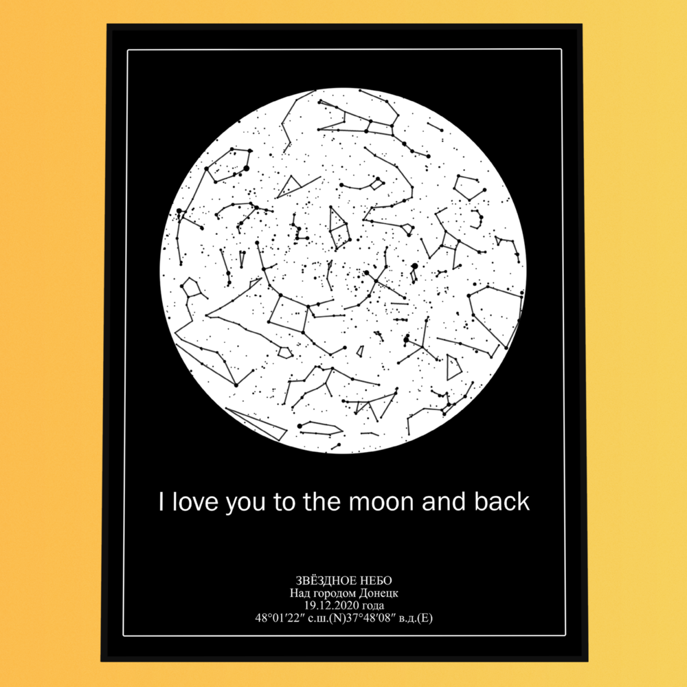 Вы заказываете персональную звёздную карту — визуальный макет, отображающий расположение звёзд в конкретный момент времени и в выбранной точке на Земле. Карта создаётся на основе астрономических данных и оформляется в выбранном дизайнерском стиле.