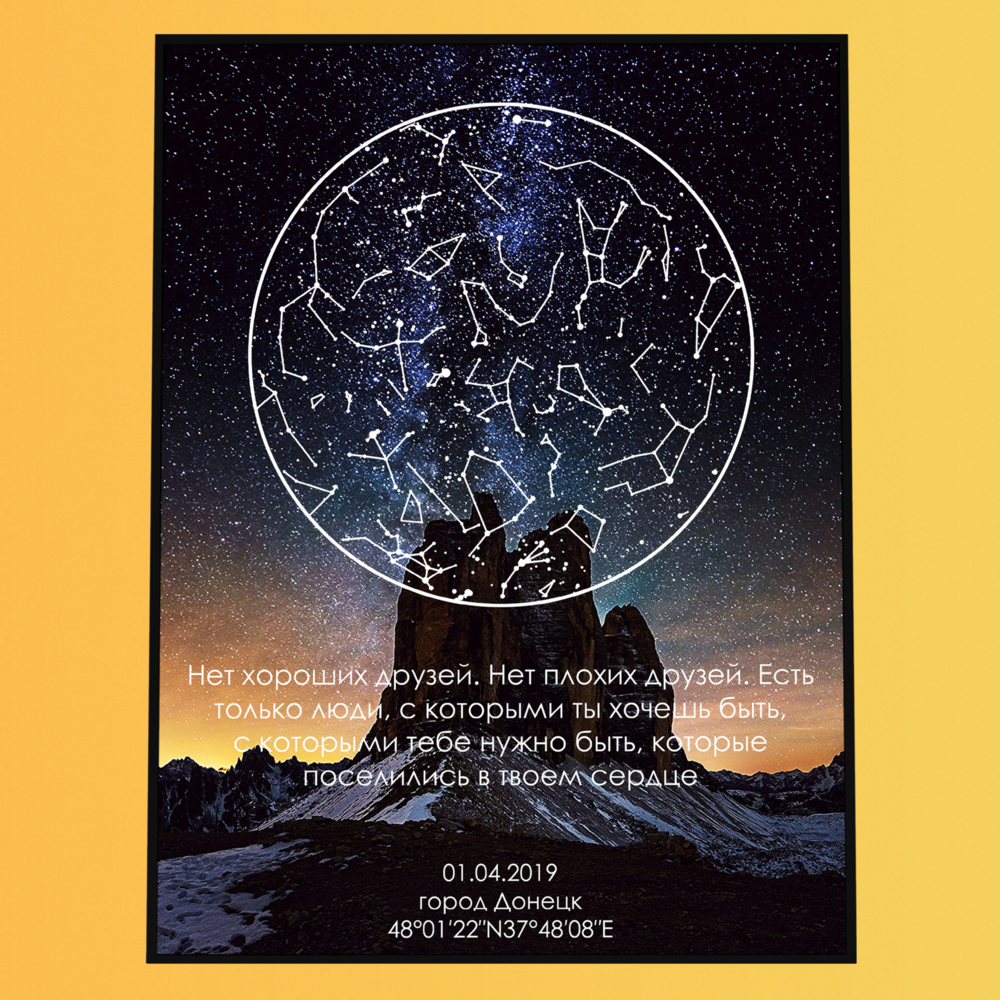 Вы заказываете персональную звёздную карту — визуальный макет, отображающий расположение звёзд в конкретный момент времени и в выбранной точке на Земле. Карта создаётся на основе астрономических данных и оформляется в выбранном дизайнерском стиле.