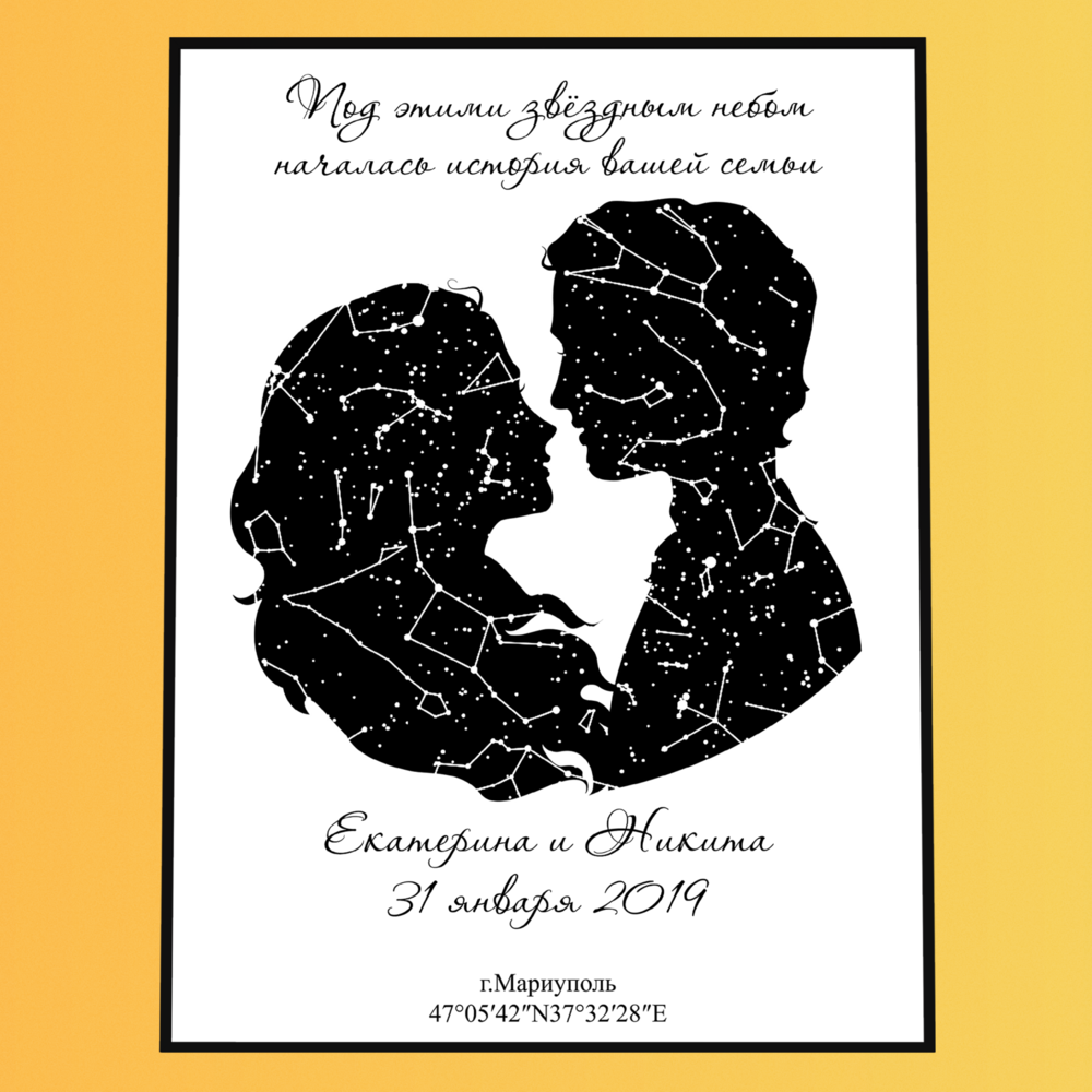 Вы заказываете персональную звёздную карту — визуальный макет, отображающий расположение звёзд в конкретный момент времени и в выбранной точке на Земле. Карта создаётся на основе астрономических данных и оформляется в выбранном дизайнерском стиле.